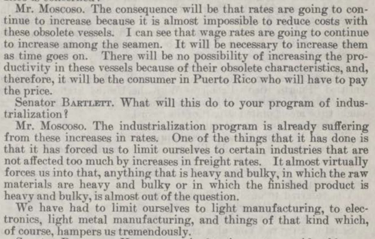In 1961 congressional hearings Teodoro Moscoso, the head of a Puerto Rican government initiative tasked with sparking the island’s industrialization, testified that high Jones Act shipping rates had placed industries involving heavy and bulky raw materials or finished products “almost out of the question.” These high rates, he added, meant that Puerto Rico had been limited to “light manufacturing, to electronics, light metal manufacturing, and things of that kind which, of course, hampers us tremendously [emphasis added].”